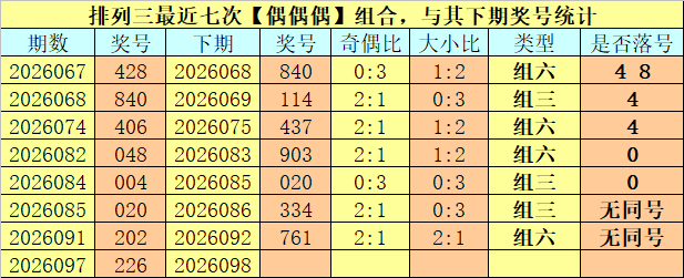 奇偶分析:排列三上期奖号为226,其奇偶类型为【偶偶偶】,最近七次出现奇偶类型偶偶偶的号码分别为:428、840、406、048、004、020、202,其下期奖号分别为:428、840、406、048、004、020、202。其中号码奇偶比为10:11,奇偶号码开出频次基本相当,本期注意偶数号码转热,重点关注全偶组合出现。